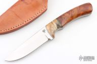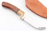 This hunter by RBS Knives features a mirror polished blade with .160" blade stock and 1.078" blade depth, full tang construction. The handle has maple burl bolsters, Brazilian Cherry wood scales with black/brass spacers. Comes with a brown leather sheath. Has a few light scratches, otherwise excellent condition.