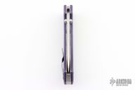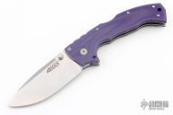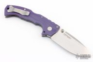 The 4-Max, by Cold Steel, features a drop point blade composed of tumbled finished CPM-20CV steel and dual thumb studs. The tip up carry pocket clip and backspacer are both titanium. The handle consists of desert tan G10 scales that have been dyed purple. Comes with original box. Strong lockup and detent; excellent condition. Mod by Slicey Dicey.