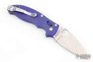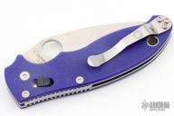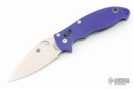 This Spyderco Manix 2 has a satin finished blade, thumbhole and notched thumbrest. The handle has a purple G-10 scales over steel liners and backspacer. Lanyard tube in pommel. Includes original box and papers. Stainless steel reversible tip up clip. Comes with original box and papers. Has a couple light scuffs, otherwise Excellent Condition.