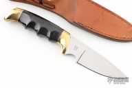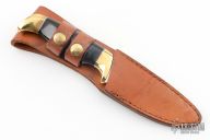 This Model 1030 Deer Hunter by Kershaw Knives features a polished drop point blade with notched thumbrest, .157" blade stock and 1.135" blade depth, hidden tang construction. The handle is comprised of brass guard and pommel, steel spacers and hand contoured phenolic handle over hidden tang construction. Includes leather sheath with belt loop. Excellent condition. This model has been discontinued.