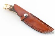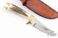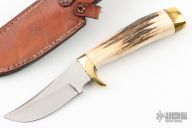 This Hunter by Dan Harrison features a satin finished blade with false top edge, .187" blade stock and 1.030" blade depth, hidden tang construction. The handle has a brass guard and butt with a stag grip. Hand signed by Dan Harrison. Comes with a brown leather sheath. Excellent condition.