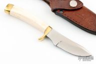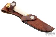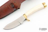 This Hunter by Dan Harrison features a satin finished blade with false top edge, .176" blade stock and 1.019" blade depth, hidden tang construction. The handle has a brass guard and butt with a stag grip. Hand signed by Dan Harrison. Comes with a brown leather sheath. Excellent condition.