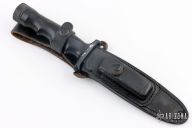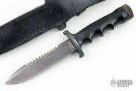 This Wilderness by Explorer Knives features a black blade with sawteeth, .172" blade stock and 1.229" blade depth, hidden tang construction with a hollow stainless steel handle. Comes with black leather sheath. Has scratches, has wear on the handle, otherwise fair condition.