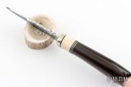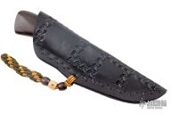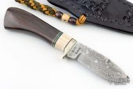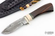 This hunter by Roger Shirley features a Damascus blade with fileworked spine and false top edge, .151" blade stock and 1.115" blade depth, hidden tang construction. The handle has a nickel silver guard, Macassar Ebony wood grip with bone/black/nickel silver spacers. Comes with a hand tooled black leather sheath. Has a couple oxidation spots, otherwise good condition.