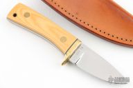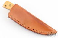 This drop point hunter by Carolyn Tinker features a polished blade with .199" blade stock and 1.175" blade depth, full tang construction. The handle has a brass guard with Westinghouse paper micarta scales with black liners and brass pins. Comes with a brown leather sheath. Has some light patina, otherwise excellent condition. "CD2 026" on the b-side of the blade.