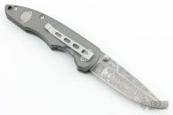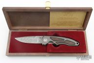 This Damast I linerlock folder features a drop point Damascus blade with dual thumbstuds. The handle has an aluminum frame with wood inlays, tip down stainless steel clip. #1709. Comes with wood display box, and papers. Excellent condition.