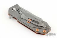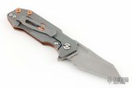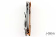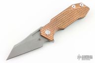 This Half Track from Hinderer Knives features a working finished blade with fullers, notched thumbrest and flipper. The handle has a working finished titanium frame with a textured copper scale. Titanium clip is positioned for tip up, right hand carry. Comes with original box, G-10 scale and titanium liner, a set of copper screws, copper spacers and extra hardware. Has a few light scuffs, otherwise excellent condition.