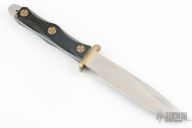 The M5 is one of EKs most popular models with a satin finish clip point blade. The handle is black linen micarta with brass "X" head pins. Brass double guard Full tang construction with thickness of .192" and depth of 1.272". Tang extends 3/4" at the butt with a lanyard hole. Excellent condition.