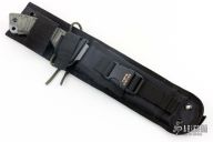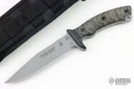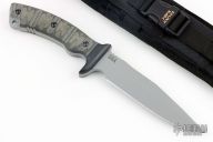 This knife features a grey coated blade with notched thumbrest, .252" blade stock and 1.362" blade depth, full tang construction. The handle has black linen micarta scales with white liners. Comes with a black nylon sheath. Excellent condition.