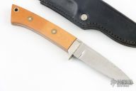 This knife by Melvin Dunn features a mirror polished blade with .177" blade stock and 1.008" blade depth, full tapered tang construction. The handle has a nickel silver guard, Westinghouse paper micarta scales with black liners and a lanyard hole. Comes with a black leather sheath. Has scratches, has been used and resharpened, has some oxidation spots, fair condition.