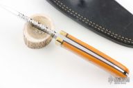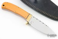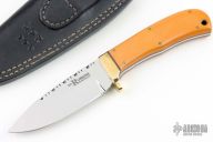 This knife by HP Robbins features a mirror polished blade with fileworked spine, .189" blade stock and 1.198" blade depth, full tapered tang construction. The handle has a brass guard and Westinghouse paper micarta scales with black/red liners. Comes with a black leather sheath. #275 on the blade and sheath. Excellent condition.