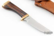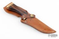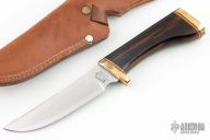 This hunter by Edge Mark features a satin finished blade with notched thumbrest, .121" blade stock and 1.172" blade depth, hidden tang construction. The handle has a brass guard and butt, rosewood grip with red/white spacers. Comes with a brown leather sheath. Excellent condition.
