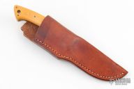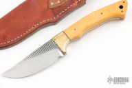This hunter by Manwho Knives features a satin finished blade made from a farrier's rasp, .187" blade stock and 1.270" blade depth, full tang construction. The handle has brass bolsters, Westinghouse paper micarta scales with black liners. Comes with a brown leather sheath. #441 on the guard and stamped "MANWHO" as well. Has some oxidation on the tang, otherwise excellent condition.