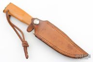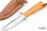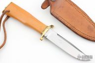 This Sting by Morseth Knives features a polished laminated steel blade with false top edge, .162" blade stock and .939" blade depth, hidden tang construction. The handle has a brass guard, Westinghouse paper micarta grip with black/brass spacers and a brass butt. Comes with a brown leather sheath. Has some scratches and patina, otherwise good condition.