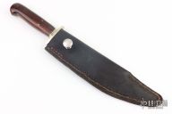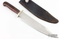 This bowie features a satin finished blade with a nearly sharpened top edge and fileworked spine, .254" blade stock and 2.014" blade depth, hidden tang construction. The handle has a nickel silver guard with an ironwood grip. Comes with a black leather sheath with belt stud. Has a few light scratches, otherwise excellent condition.
