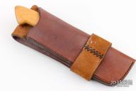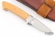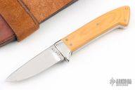 This knife by Michael J Teitler features a mirror polished blade with .251" blade stock and 1.062" blade depth, full tang construction. The handle has a stainless steel guard and Westinghouse paper micarta scales. Comes with a brown leather sheath. Has some light scratches, and some oxidation on the tang, otherwise good condition.