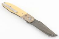 This Cygnet by Nick Swan features a San-Mai Damascus blade with elongated swedge and a notched flipper. The handle has a mokume bolsters with titanium pivot collars, Westinghouse micarta, satin finished titanium liners, backspacer and tip up titanium clip with hidden screws. Rides on bearings, nice detent, lockup and blade seating. Has a couple light scuffs, excellent condition otherwise.
