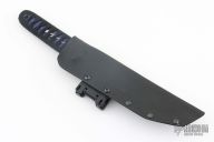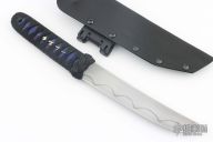 This knife by Robert Douglas features a hand rub satin finished blade with a gorgeous hamon, .215" blade stock and 1.234" blade depth, hidden tang construction. Handle is black cord wrapped over blue stingray skin and a lightning menuke. Comes with a kydex sheath with TekLok. Has some light scratches, otherwise excellent condition. Comes with a zippered case.