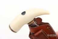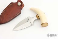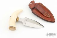 This knife by Lloyd Hale features a satin finished double edged blade with .212" blade stock and 1.295" blade depth, hidden tang construction. The handle has a brass guard and fileworked butt cap, narwhal tooth handle. "LBM 1973" engraved on the butt cap. Comes with a brown leather sheath. Has a couple cracks, otherwise excellent condition.
