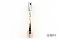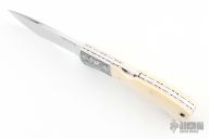 This midlock by Scott Sawby and Steven Mullin features a mirror polish drop point blade. The handle features engraved steel bolsters, bone scales and a file worked titanium liners, with stainless spring. Comes with a zipper case. Has a couple light scratches, excellent condition otherwise.