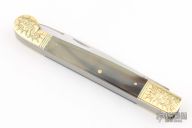 This lipjoint by Joel Chamblin features hand-rubbed satin finished blade with nail nick and swedge. The handle has engraved brass bolsters, stainless steel liners, and horn covers with a stainless steel spring. Comes with a zippered case. Has half-stop, flush in all positions. Lytton engraved. Excellent Condition.
