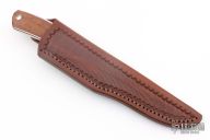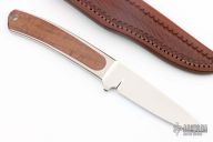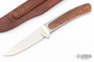 This hunter by Mike H Okamura feaures a mirror polished drop point blade, .152" blade stock and 1.040" blade depth at the ricasso, integral "tuning fork" construction. The handle has a curly koa wood grip with lanyard hole. Comes with a hand tooled black leather sheath. Excellent condition.