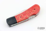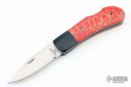 This Lockback Folder by Truncali Custom Knives features a hand rub satin finished clip point blade with nail nick and file worked blade spine. The handle is comprised of g10 bolsters and apple coral covers over steel liners and fileworked rockerbar. Has a couple light scuffs, excellent condition.