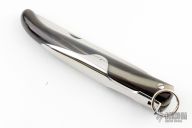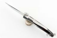This Yatagan Ring Folder by Jaques Mongin features a mirror polished blade with nail nick. The handle is a single piece of buffalo horn with a mirror polished stainless steel ring pull lock. Excellent condition.