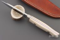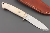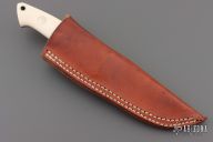 This Loveless Style drop point hunter by WC Davis features a mirror finished drop point blade, nickel silver fittings, and mammoth ivory scales with red liners, .184" blade thickness and .956" blade depth, full tapered tang construction. Comes with a brown leather sheath. Excellent condition.