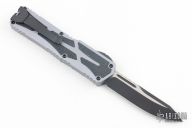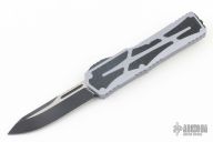 This Colossus by Heretic Knives features a two-tone blade with fullers, and notched thumbrest. The handle has a gray aluminum frame with non-slip inlays, checkered thumb slide, stainless steel tip down clip. Comes with original box. S/N 01319. Has some light wear on the clip, otherwise excellent condition.