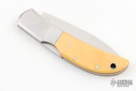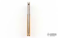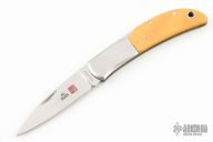 This knife by Al Mar features a mirror finished blade with nail nick. The handle has stainless steel bolsters, yellow paper micarta scales, brass liners, and a stainless steel backspacer. Has some scratches, otherwise good condition.