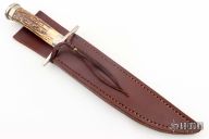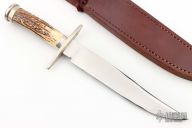 This Bowie by Walter Kneubuhler features a mirror polished bowie blade with a false top edge, .236" blade stock and 1.467" blade depth, hidden tang construction. The handle has a nickel silver guard and butt with a stag grip. The butt cap is engraved. Comes with brown leather sheath. Has a couple light scratches otherwise excellent condition.
