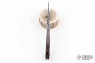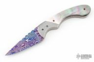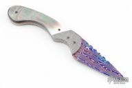 This knife from PJ Ernest features a heat blued Damascus blade with fileworked spine, .126" blade stock and .848" blade depth, full tang construction. The handle is comprised of Damascus bolsters and black lip pearl scales. Excellent condition. Comes with a zippered case.