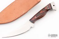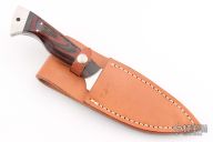 This fixed blade from Tom Barminski features a mirror polished blade with .176" blade stock and 1.206" blade depth, full tang construction. The handle has dymondwood scales and stainless steel rear bolsters with lanyard hole. Includes a brown leather sheath with belt loop. Has some oxidation on the tang, otherwise excellent condition. Comes with a zippered case