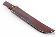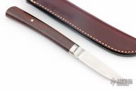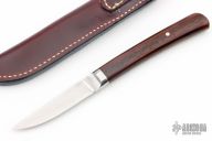 Lovely little drop point with integral bolster from Boye Knives features a drop point satin finished blade. The handle has an integral bolsters, cocobolo grip, hidden tang construction, .102" blade stock and .610" blade depth. Includes a brown leather sheath with belt loop. Excellent condition.