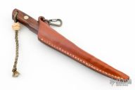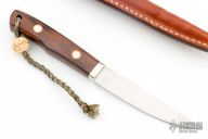 This knife by Hiroshi Saito features a hand rub satin finished blade with .082" blade stock and .670" blade depth, hidden tang construction. The handle has a nickel silver guard, ironwood grip with lanyard hole. Comes with a brown leather sheath. Excellent condition.