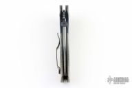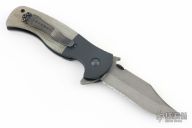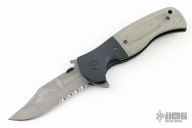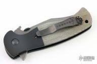 This Po-Boy Sheepdog flipper from Emerson Knives was turned into a Po-Boy by Andrew Charlet. It features a thunderstorm finished partially serrated blade with notched thumbrest and flipper. Knife can be opened using the thumb disk, wave feature or flipper. The handle has black titanium dovetailed bolsters, canvas micarta scales, black titanium liners with black barrel spacers and black stainless steel pocket clip positioned for tip up carry. Excellent condition. #0027. Comes with original box and black G-10 scales.