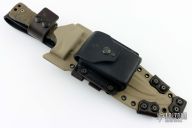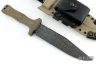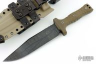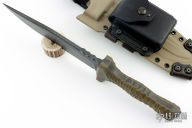 This Custom M-22 by Miller Bros Blades features a two-tone clip point blade with textured spine made from Z-Wear PM steel, .307" blade stock 1.966" blade depth, full tang construction. The handle has textured green G-10 scales, lanyard holes at the butt. Comes with a kydex/leather sheath and COA dated 1-2024. New condition.