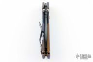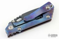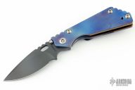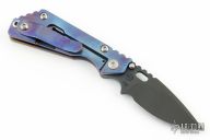 This PT by Mick Strider features a black blade with notched thumbrest and thumbhole. The handle has an orange peel finished and anodized titanium frame with matching tip up clip. New condition.