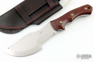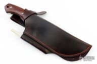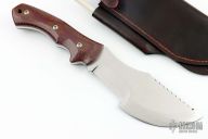 This WSK by Juergen Schanz features a satin finished blade with sawteeth on blade spine, full tang construction with .243" blade stock and 2.580" blade depth. The handle has brown burlap and red canvas micarta scales with a lanyard hole at the butt. Includes a brown leather sheath with belt loop and sharpening rod. New from maker!