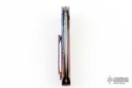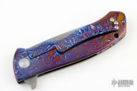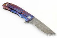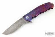 This Torrent Framelock Flipper by DB Fraley features a Damasteel recurve blade with false top edge and notched thumbrest, has flipper. The handle has a full Timascus frame, has a lost skulls carved backspacer, matching Timascus tip up clip and lanyard hole at the butt. Comes with a leather slip case and , patch, sticker, and COA dated 12/14/16. Excellent condition.