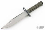 This M9 Phrobis III features a bead blasted spear point blade with sawteeth on the spine and a large fuller, .234" blade stock and 1.428" blade depth, hidden tang construction. The handle has a black steel guard and green plastic grip and can be removed from the handle for cleaning. Has some scuffs and scratches, great condition otherwise.