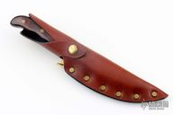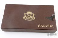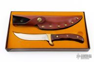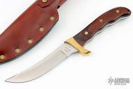 This Akonua by Buck Knives features a satin finished upswept blade, .180" blade stock and .977" blade depth, full tang construction. The handle has a brass guard and dymondwood scales with brass pins. Comes with a brown leather sheath, original box and papers. Excellent condition.