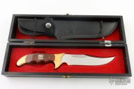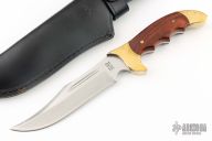 This Model 3010 by G96 Brand features a satin finished blade with fullers and false top edge, .168" blade stock and 1.253" blade depth, full tang construction. The handle has brass bolsters, wood scales with brass pins. Comes with original box and black leather sheath. Has some light scratches, otherwise excellent condition.