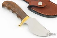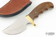 This skinner by VL Knives (please let us know if you know more about this maker) features a satin finished blade with .098" blade stock and 1.596" blade depth, full tang construction. The handle has a brass guard and wood scales. Comes with original box and brown leather sheath. Excellent condition.