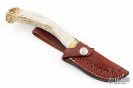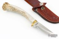 This Knife by Silver Stag features a satin finished blade with .187" blade stock and 1.084" blade depth, hidden tang construction, The handle has a brass guard and a crown stag grip. Comes with a hand tooled brown leather sheath, original box and papers. Has scratches, has been resharpened, otherwise good condition.