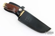 This Hunter by Kassnar features a satin finished blade with .200" blade stock and 2.012" blade depth, hidden tang construction. The handle has brass guard and butt, wood grip with black/brass spacers. Comes with original box and black leather sheath. Excellent condition.