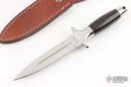 This Trooper by Kershaw Knives is a mirror polished double-edged dagger with fullers, .215" blade stock and .937" blade depth, hidden tang construction. The handle has a stainless steel guard and butt with wood grip and brass spacers, lanyard hole at the butt. Comes with a brown leather sheath, original box, S/N 3074.  Excellent Condition.