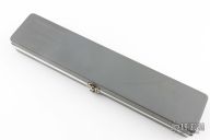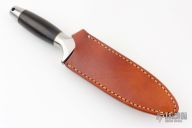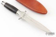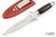 This Trooper by Kershaw Knives is a mirror polished double-edged dagger with fullers, .215" blade stock and .937" blade depth, hidden tang construction. The handle has a stainless steel guard and butt with wood grip and brass spacers, lanyard hole at the butt. Comes with a brown leather sheath, original box and papers dated April 1983 and S/N 11456.  Excellent Condition.