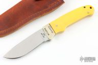 This fixed blade by Moore Maker features a mirror polished blade with .127" blade stock and 1.024" blade depth, full tang construction. The handle has nickel silver bolsters and yellow scales. Coems with original box, papers and brown leather sheath. Excellent condition.